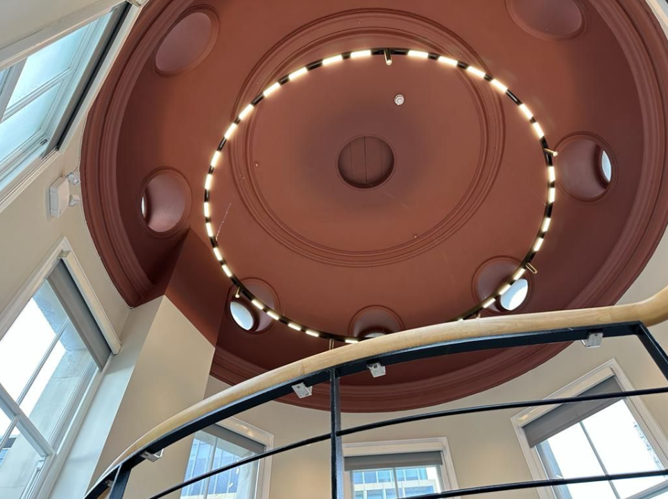 Special radius custom profiles were used to mirror the curve of the seating and an oversized magnetic circular track system with direct and indirect lighting was used to light the architectural domed tower.